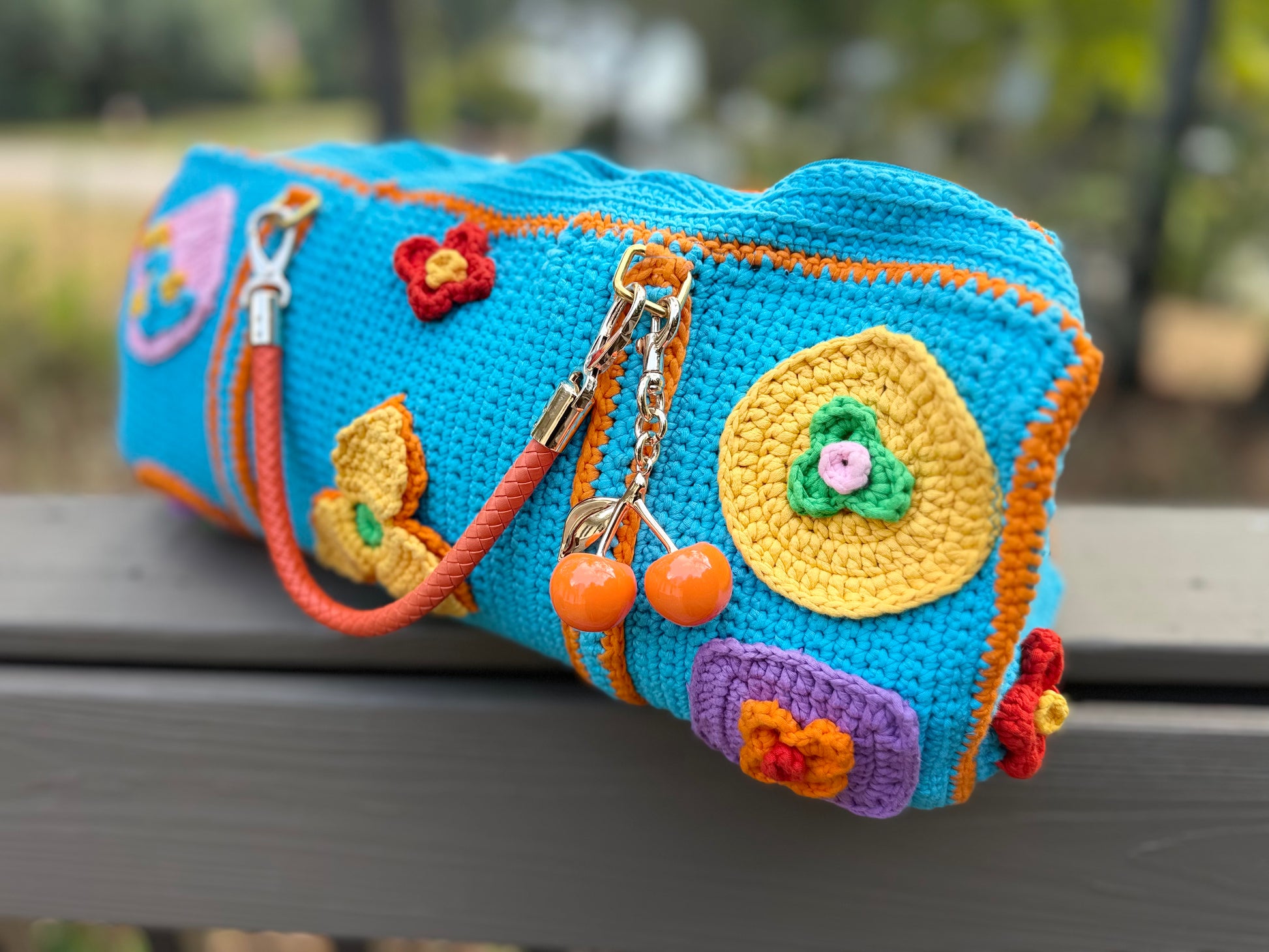 Meet the Azure Icon Luxe Large Duffel—the iconic bag that started it all. This breathtaking piece, in sky aqua blue with vibrant orange handles and crocheted embellishments, introduced Luxe By Lai to the world. It's finished with a blue satin floral lining and classic crown and bee pins.