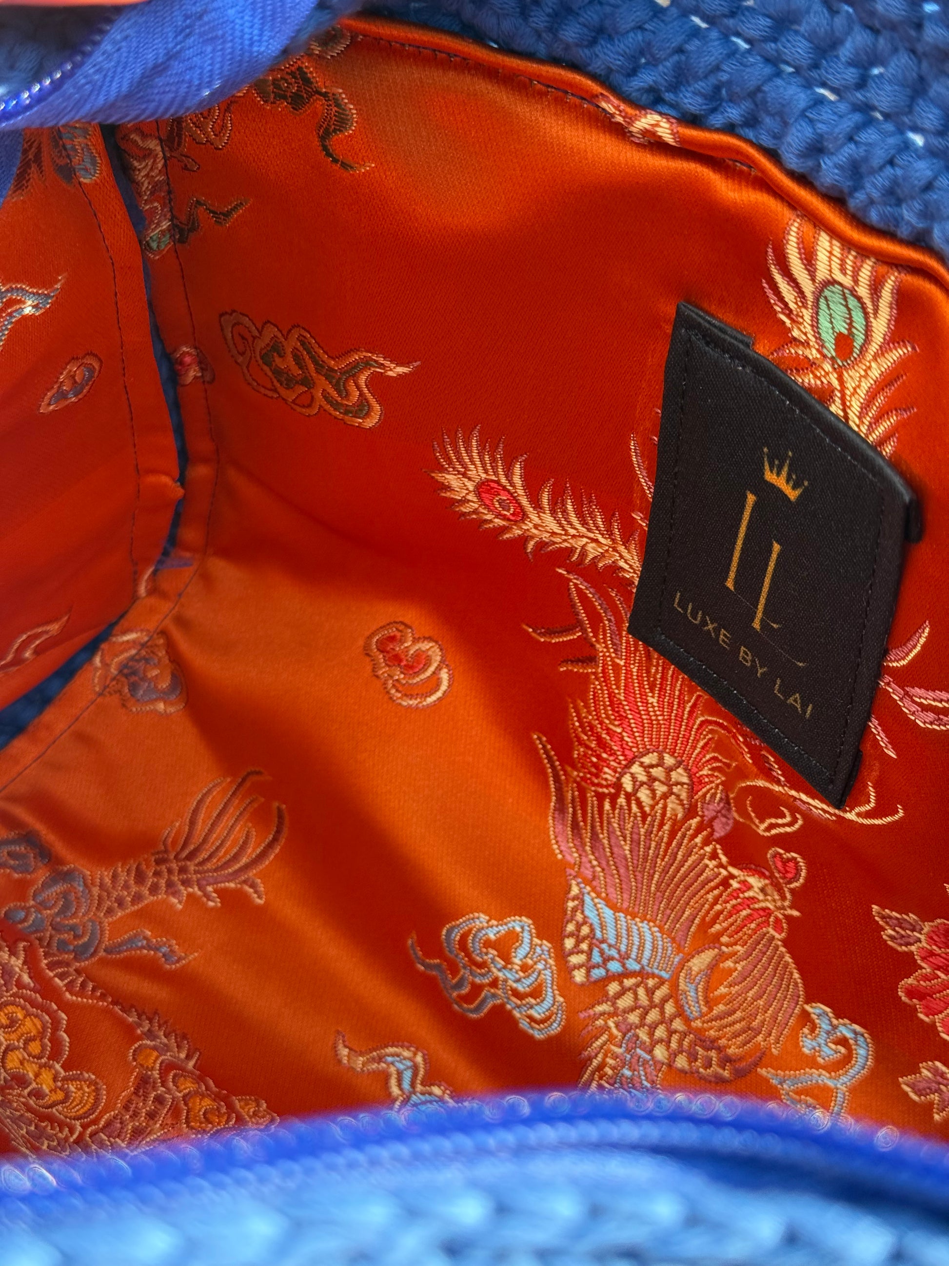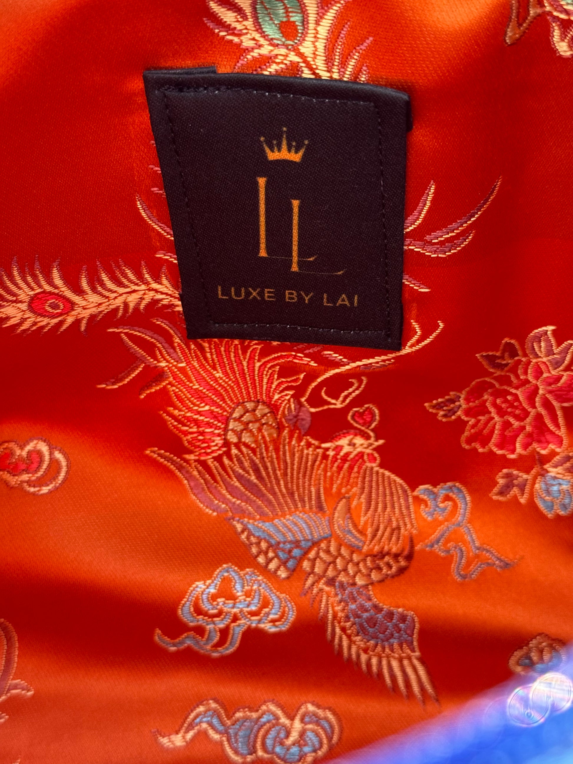A striking square-shaped crossbody, featuring a vibrant blend of electric blue leather and gold chain. Adorned with gold accents and the classic LL Lux by Lai silver emblem, this bag dazzles with blinged-out crown and bee pins—signature touches of the Luxe collection. The interior reveals a luxurious orange satin lining with elegant dragon motifs, adding an oriental flair. Finished with our Luxe label, this piece is a bold fusion of opulence, edge, and quiet confidence.
