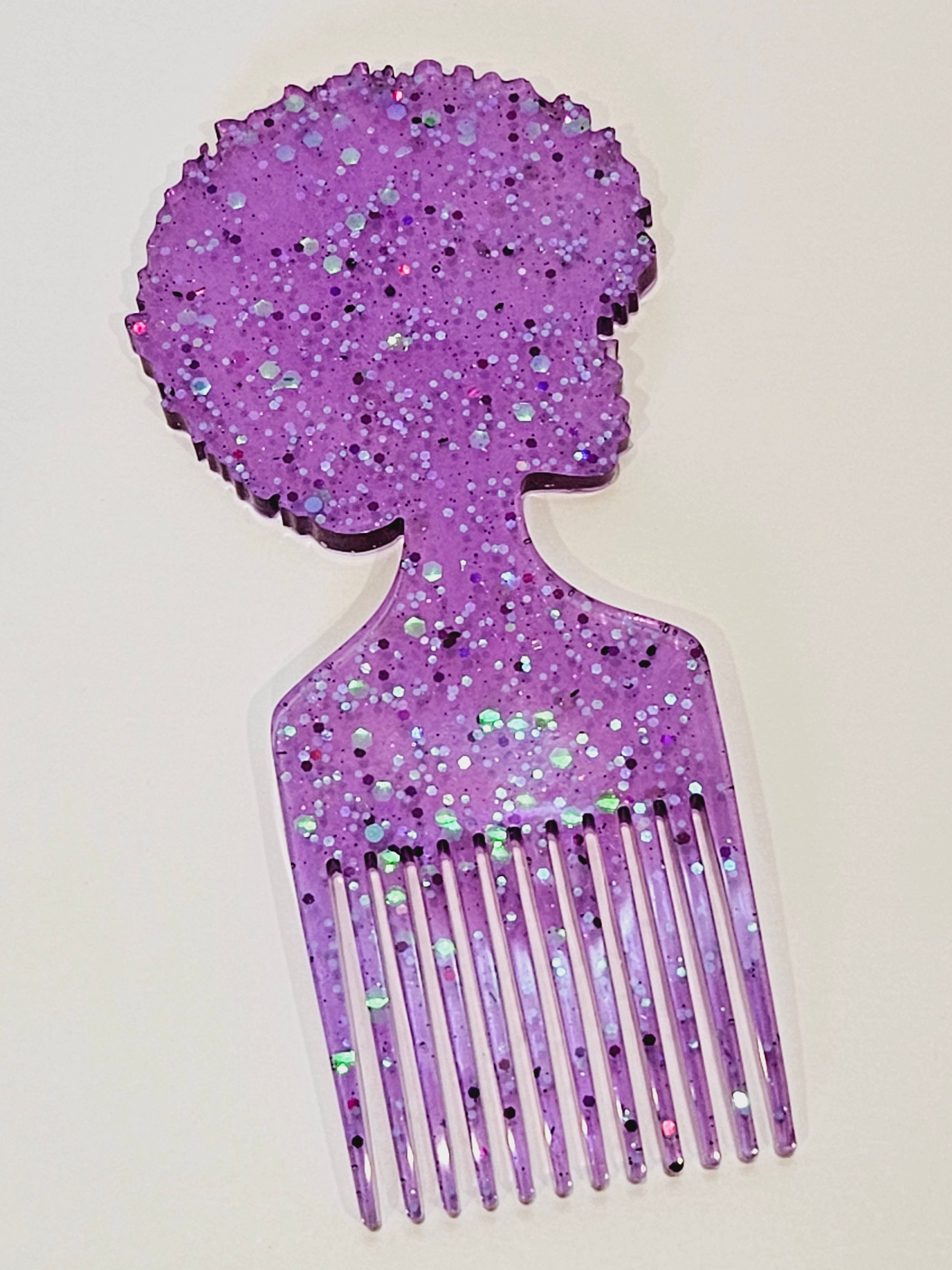 The Afro and Afro Puff Handmade Resin Hair Picks are perfect for adding pizzazz to your 'do. Made from lightweight and durable solid-colored resin, these picks boast eye-catching glitter, making them a great accessory tool for any hairstyle. Their unique shapes are designed for a secure and comfortable hold, while the texture helps smooth and define your strands for voluminous, effortless styling. Whether you opt for classic simplicity or a bold, glittery statement, these handmade resin hair picks will be your go-to for a show-stopping look.