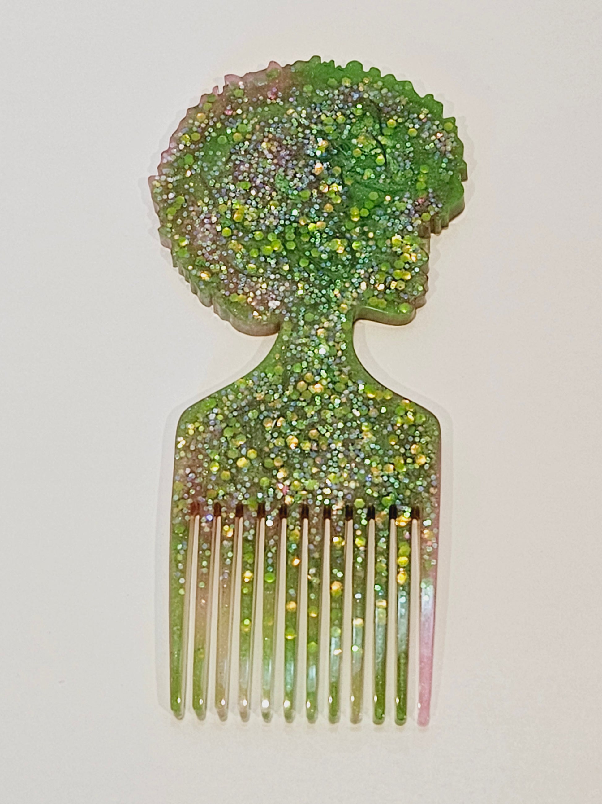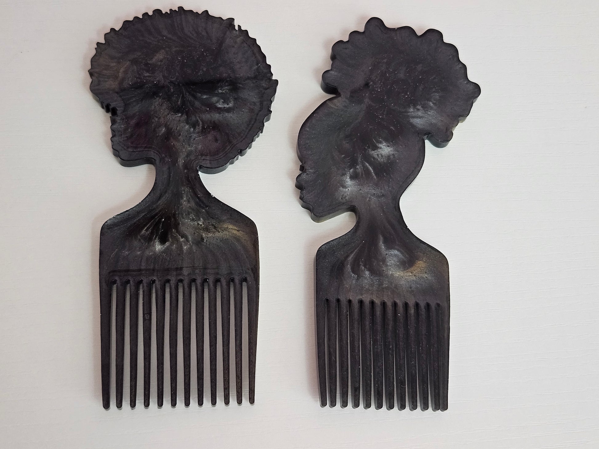 These handmade resin hair picks are sure to add the perfect amount of poppin' style to any hairstyle. They are made with quality mica powders, giving each pick a unique, sparkly swirl pattern. These picks are designed to add definition to all afro and afro puff hairstyles. The intricate design makes them perfect for adding touches of personality and individuality to any look. The lightweight, durable design is also very comfortable to use, making styling your hair a breeze. These picks are sure to upgrade your look and bring in major compliments.