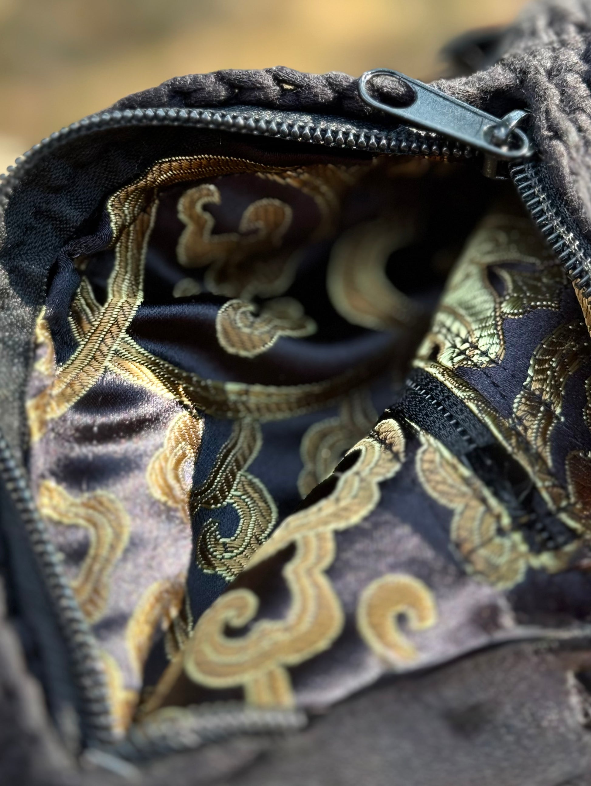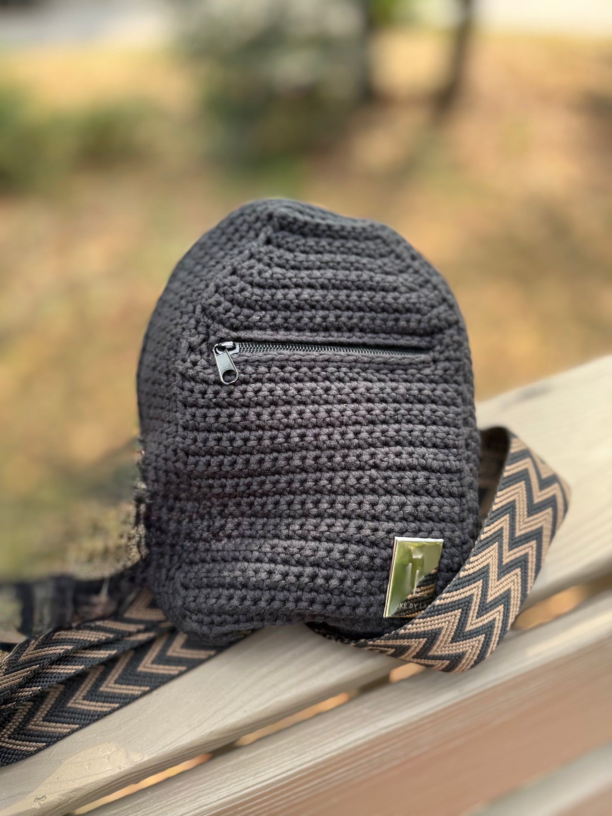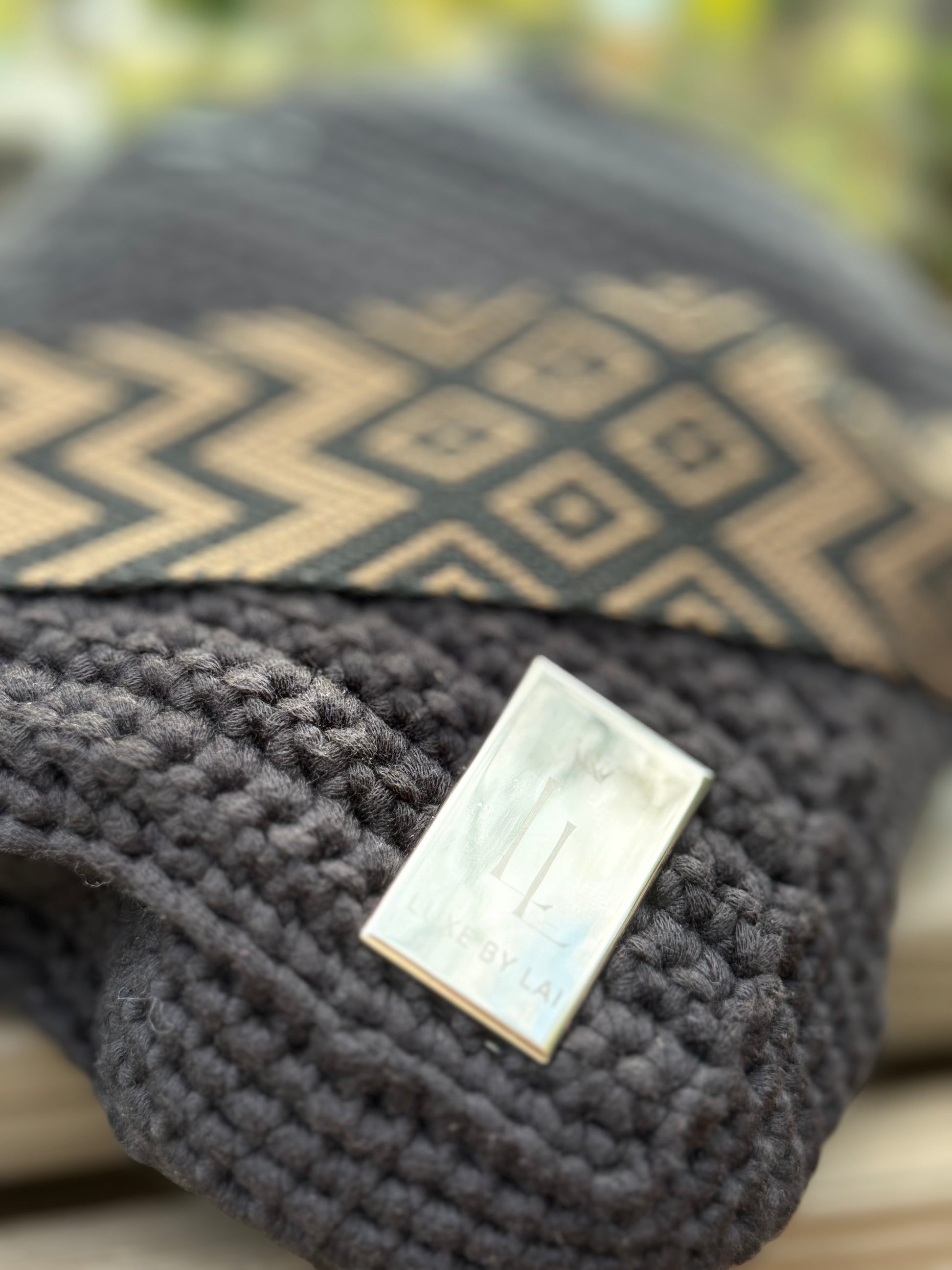 Meet our Luxe Metro Crossbody, a fusion of elegance and functionality. This black crochet bag boasts a gold and black strap, silver-engraved logo, and sumptuous satin lining. With gold hardware and leather accents, it's the epitome of understated luxury.